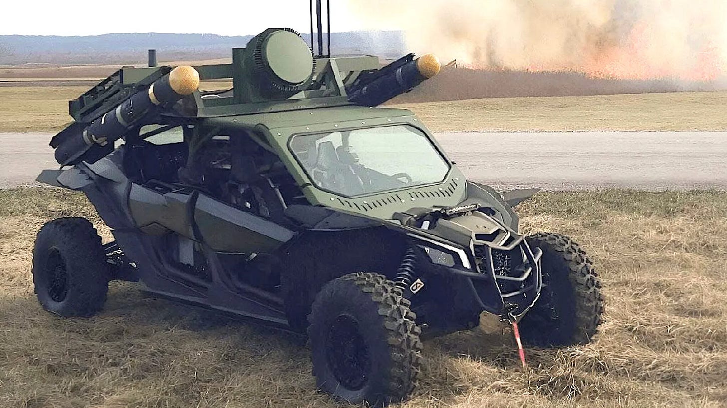 The vehicle looks like a Polaris or Can-Am UTV with two Hellfire Missiles and a mini-AESA radar.