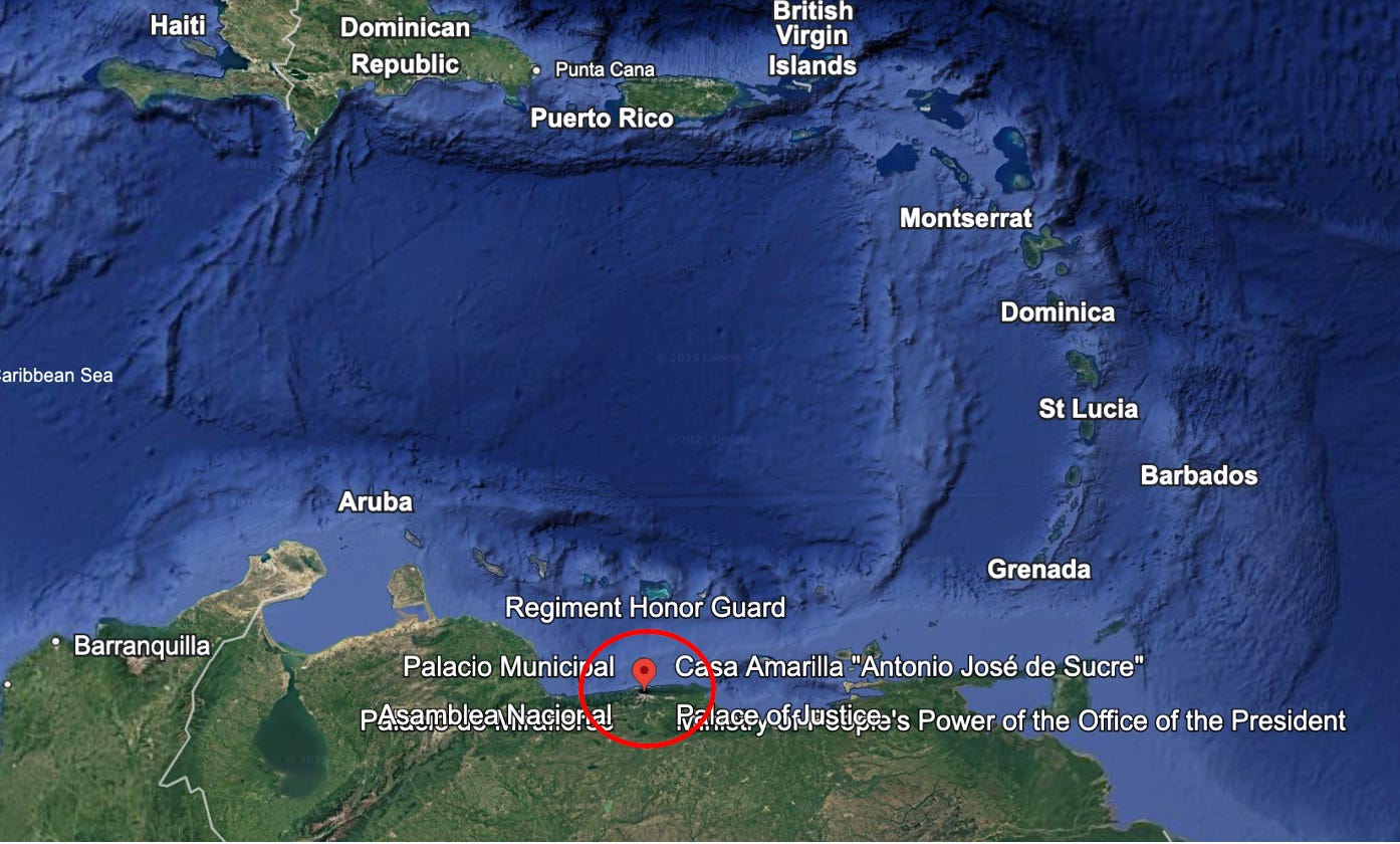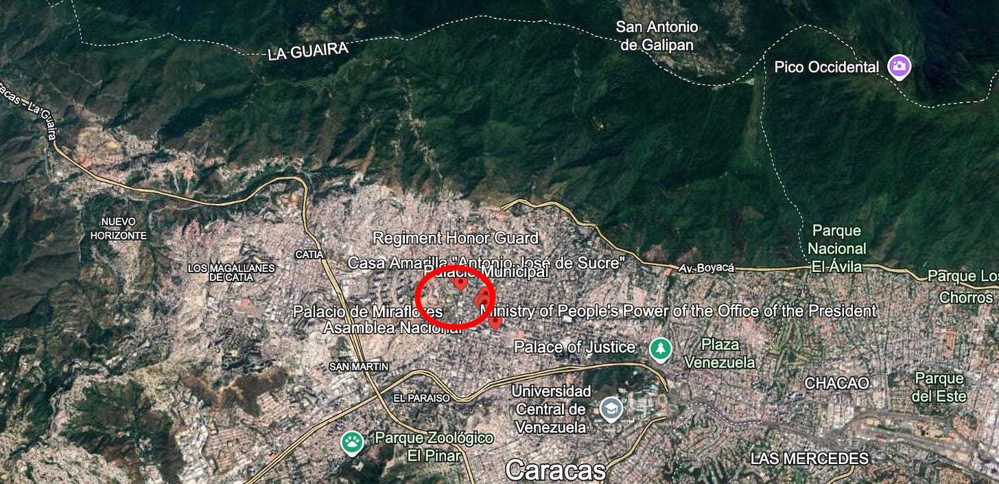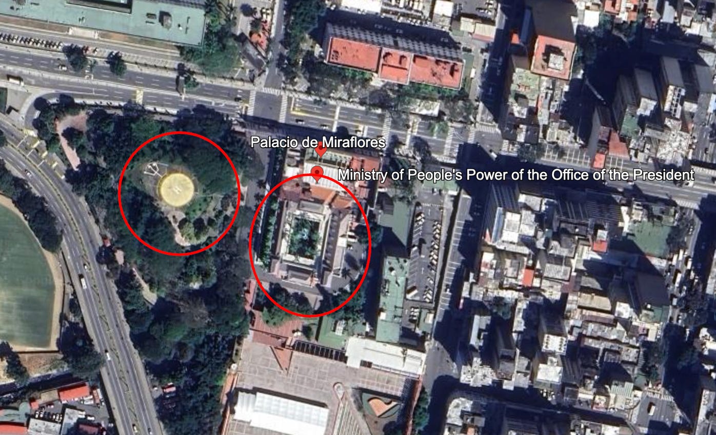 Here are some pictures to give strategic context. Was Maduro and his wife at the Presidential Palace when they were seized (first picture)? Unclear at this time, but there is an awfully convenient “H” for helicopter landing pad, within a few feet of the palace, if they were there.