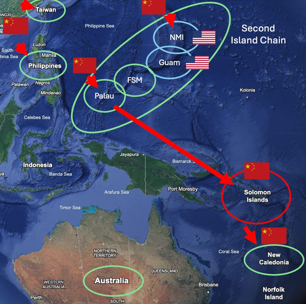 China attempts a Clausewitzean Double envelopment - with emphasis in the south mandible by seizing Palau, Solomons and French New Caledonia through Unrestricted Warfare